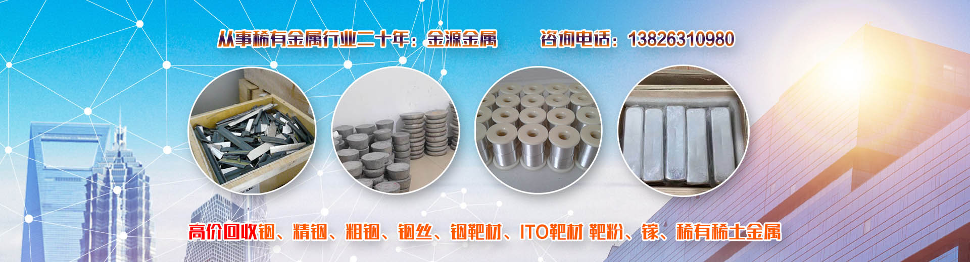 韶關(guān)市金源金屬材料有限公司坐落于中國廣東省韶關(guān)市,長期收購回收銦、精銦、粗銦、銦絲、銦靶材、ITO靶材靶粉、回收金屬鍺、鍺錠、鍺粉、鍺片、回收鍺單晶、單晶鍺、鍺粒、區(qū)熔鍺、工業(yè)鍺、廢鍺、鍺泥、鍺渣、二氧化鍺回收、四氯化鍺、有機鍺、銀、純銀、銀靶材、高價收購回收ITO廢靶、回收廢銦、廢銦沙、廢銦渣、回收粗銦、廢銦絲、廢銦珠、廢銦箔、廢銦棒、收購銀焊條、銀焊絲、導(dǎo)電銀膠、金屬鎵、硝酸鎵、氧化鎵、三氯化鎵、氯化鎵,供應(yīng)及回收氧化鎵、氫氧化鎵、碲化鎵,硒化鎵,銦粉,氧化銦、氯化銦、硫酸銦、硫化銦、醋酸銦、氫氧化銦、硒化銦,碘化銦,銅銦鎵硒,含金、銀、銦、銠、鈀、鎵、鍺等稀有貴金屬材料,稀土金屬材料、氧化鏑、氧化镥、氧化鋱、氧化鐠釹等回收。